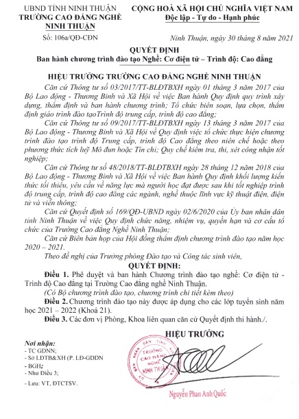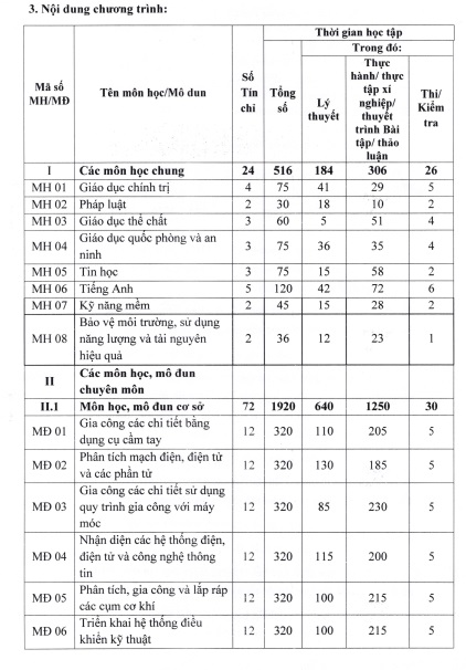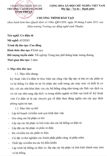 CHƯƠNG TRÌNH ĐÀO TẠO TRÌNH ĐỘ CAO ĐẲNG - NGHỀ CƠ ĐIỆN TỬ NĂM 2021