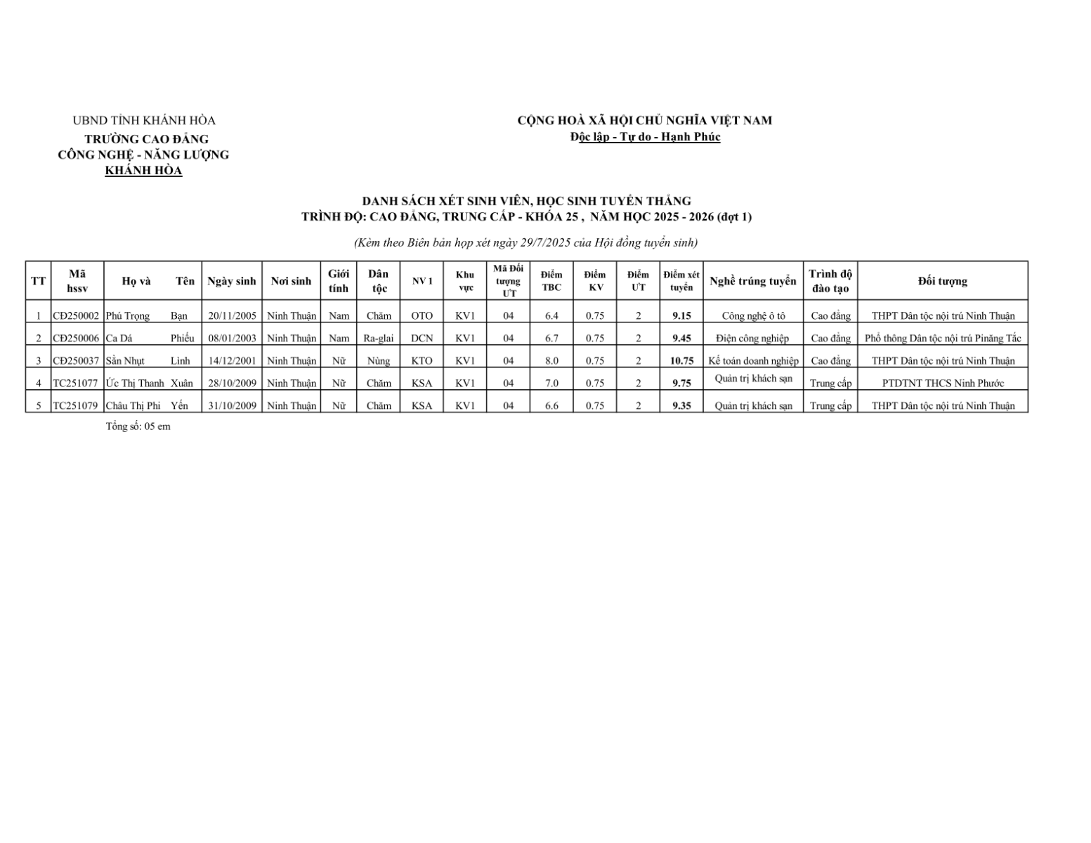 Trường Cao đẳng Công nghệ - Năng lượng Khánh Hòa (tên cũ Cao đẳng nghề Ninh Thuận) thông báo các em học sinh Khóa 25 có tên trong danh sách đến làm thủ tục nhập học